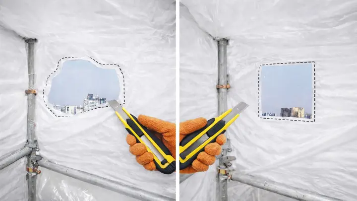 Important: If the existing shrink wrap is FR-rated, always use FR-rated patch material to maintain fire protection. SP Group supplies shrink wrap and accessories, including Scafwrap FR shrink wrap, shrink wrap double-sided tape, standard shrink wrap tape, tuff clips, and more.