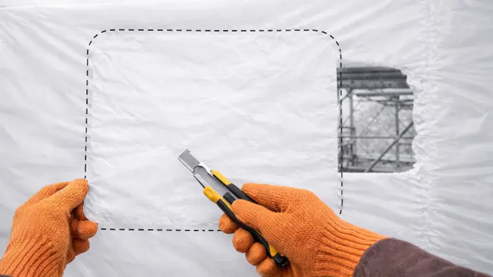 - Cut a piece of patch tape that extends at least 50 mm beyond the hole on all sides using a utility knife.